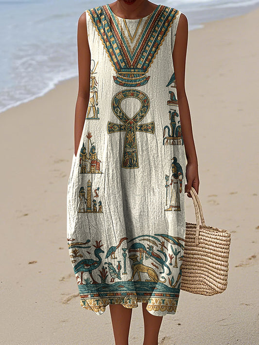 Cardydony Ancient Egyptian Inspired Women's Vintage Linen Casual Sleeveless Dress