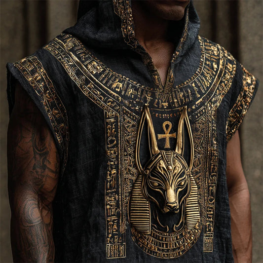 Cardydony Ancient Egyptian Anubis Ankh Golden Embroidered Hooded Linen Tank