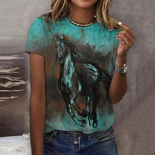 Cardydnoy Women's Horse Print Round Neck T-shirt