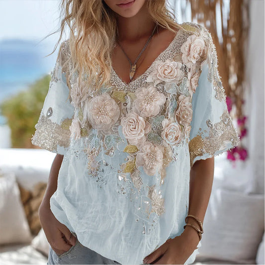 Cardydony Bohemian White Rose Rhinestone V-neck Loose Retro Short-sleeve T-shirt