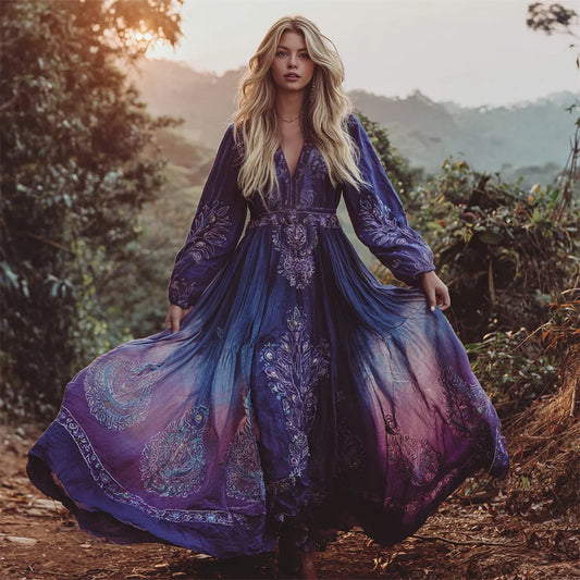 Cardydony Boho Vintage Ethnic Floral Gradient Art Women's Linen Flowy Maxi Dress