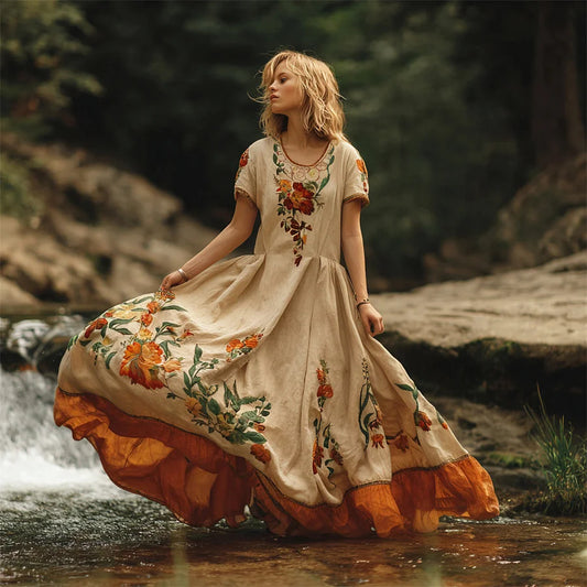 Cardydony Boho Vintage Ethnic Floral Art Women's Linen Short Sleeve Flowy Maxi Dress