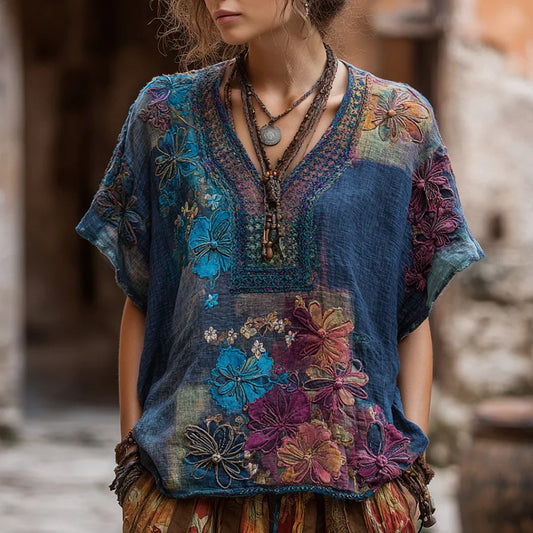 Cardydony Bohemian-style Patchwork Multi-colored Flower Three-dimensional Embroidery V-neck Short-sleeved Shirt