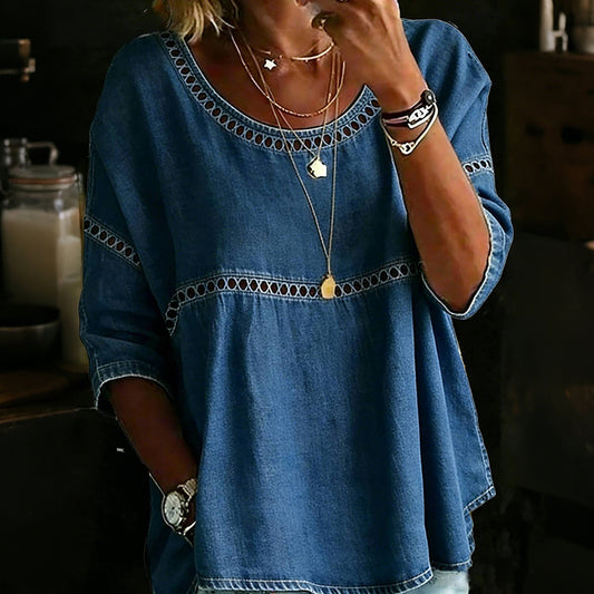 Cardydony Casual Hollowed-out Lace Patchwork Round Neck Top