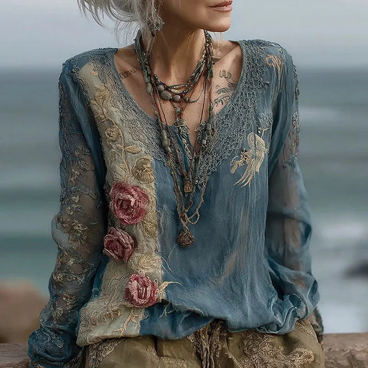 Cardydony Women's Vintage Rose Floral Embroidery Linen Shirt