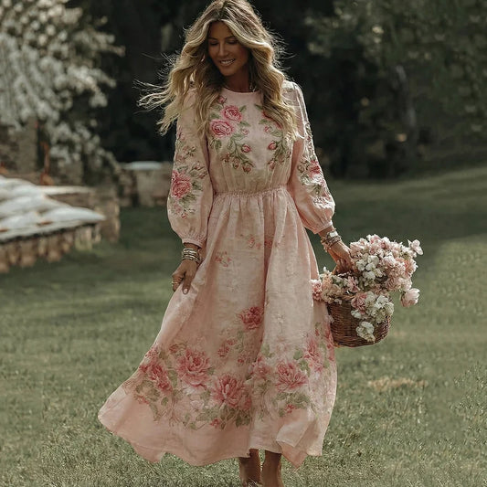 Cardydony Women's Vintage Roses Embroidery Art Crew Neck Long Sleeves Maxi Dress