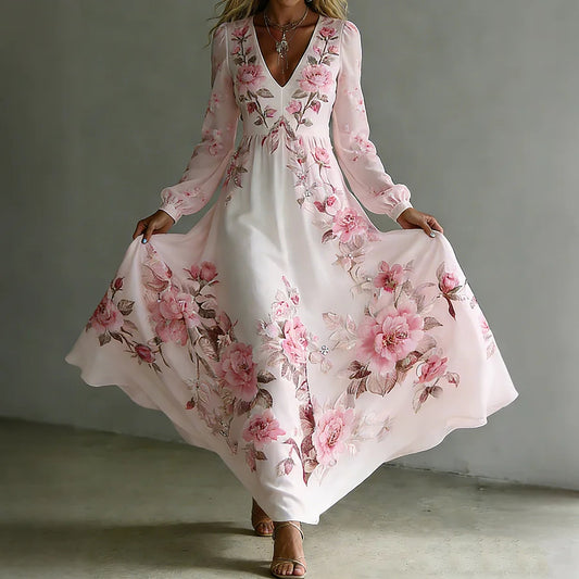 Cardydony Women's Vintage Rose Floral Gradient Pattern V-neck Long-sleeved Dress