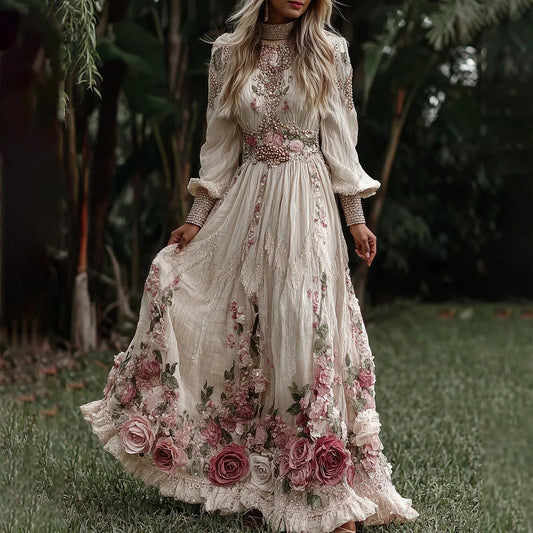 Cardydony Women's Vintage Roses Embroidery Art V-neck Long Sleeves Maxi Dress