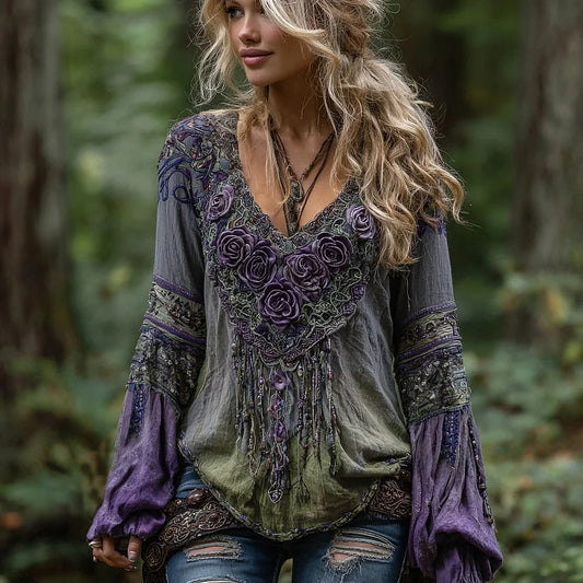 Cardydony Women's Vintage Tribal Tassel Rose Embroidery Art Pattern Linen Shirt