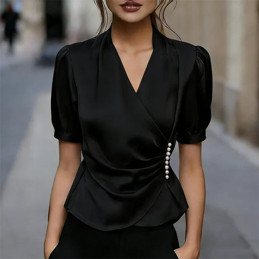 Cardydony Classy Pearls Wrap Pleated Satin Shirt
