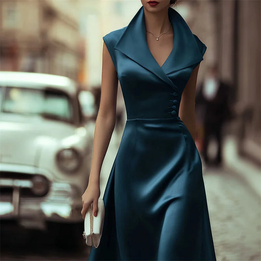 Cardydony Classy Side Buttons Lapels Flowy Satin Maxi Dress