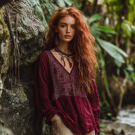 Cardydony Bohemian Tribal Embroidery Print Cotton And Linen Blend Loose Blouse