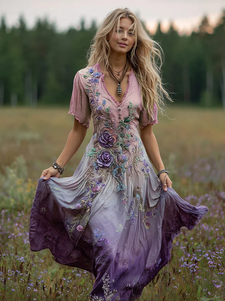 Cardydony Women's Bohemian Floral Art Gradient Linen Maxi Dress