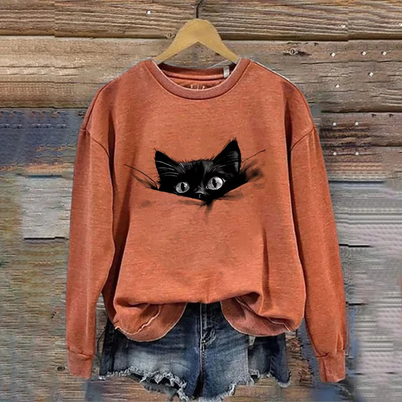 Cardydony Women's Casual Funny Black Cat Print Sweatshirt