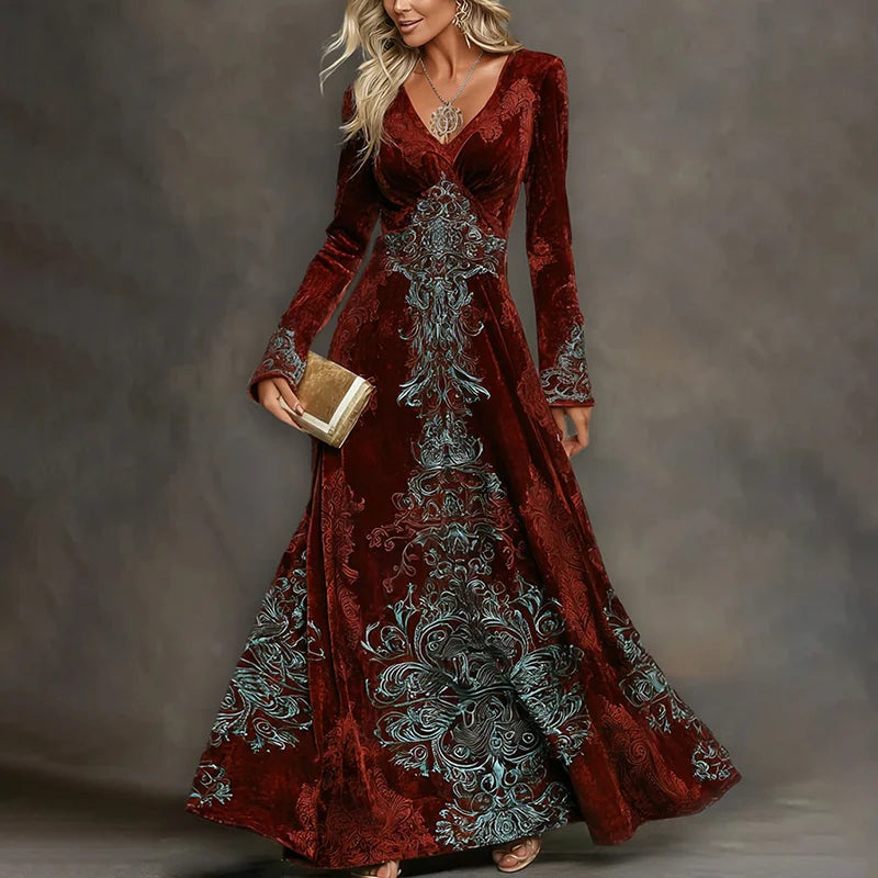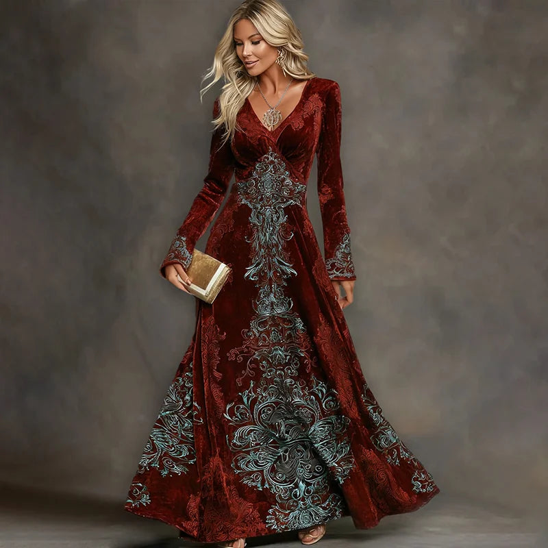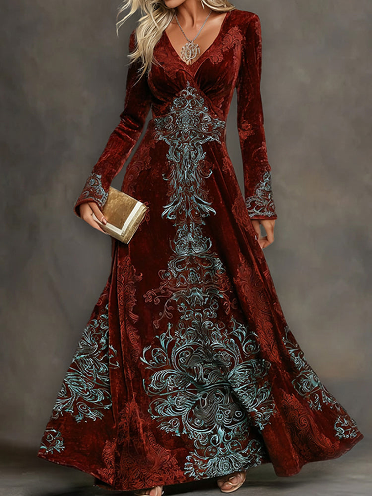 Cardydony Women's Elegant Tribal Art Comfy Velvet V Neck Maxi Dress